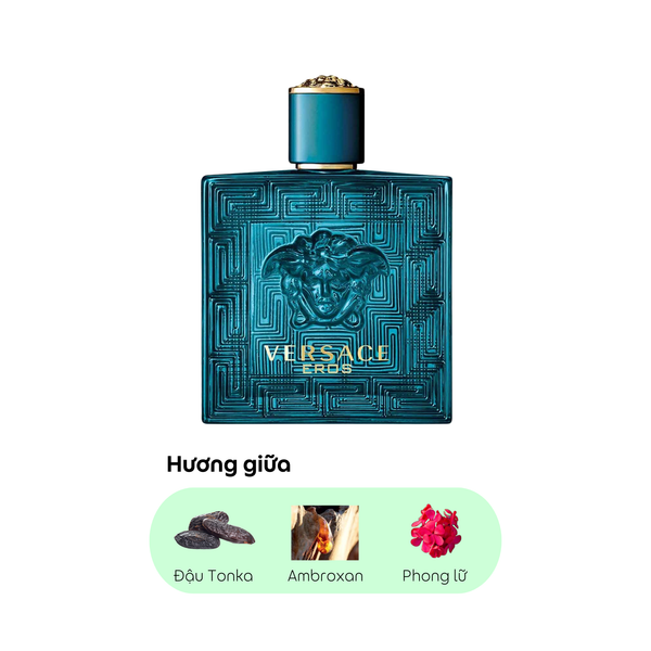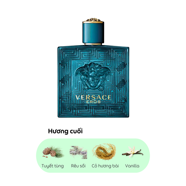 Versace Eros Eau De Toilette với những nốt hương thảo mộc phương Đông mạnh mẽ, bí ẩn nhằm khích lệ tinh thần, đam mê của phái mạnh. Tầng hương đầu của eros edt versace mở ra một không gian tràn ngập sự sảng khoái, mát lạnh bằng chiết xuất bạc hà, táo xanh và tinh dầu chanh tươi mát. Để dẫn lối các anh chàng tiếp tục khám phá những tầng hương tiếp theo. Tầng hương giữa hay còn gọi là heart notes của eros versace có phần nồng nàn và ngọt dịu hơn; phần nào trung hòa với hương cay mát ở tầng đầu tiên. Hương thơm của hoa phong lữ kết hợp với đậu Tonka cùng với hương Ambroxan nhẹ nhàng. Đưa các chàng vào không an êm dịu, thư thái. Kết lại cả chuỗi hương là sự quyến rũ, gợi cảm của cỏ Vetiver kết hợp với sự ngọt thơm của vanilla. Hòa cùng với hương ấm áp của tuyết tùng kết hợp với địa y. Để lại một cảm giác mềm mại, vấn vương bao quanh phái mạnh.